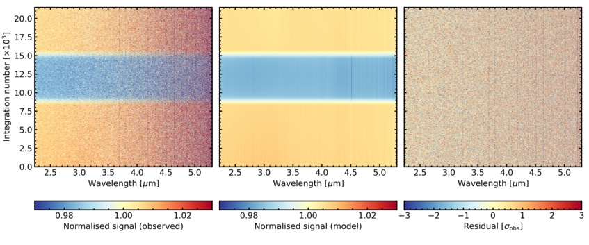 Observations of exoplanet atmospheres are key to understanding their chemical composition, climate, and potential habitability. Our team is interested in constraining the key parameters of exoplanetary atmospheres, including the chemical composition and temperature structure. To achieve this goal, we analyse the transmission spectra of exoplanets taken by space-based observatories. Some of our research activities in this area include the reduction and analysis of exoplanet transit data from the James Webb Space Telescope, and the application of machine learning in the atmospheric retrieval of simulated data for the Ariel mission.